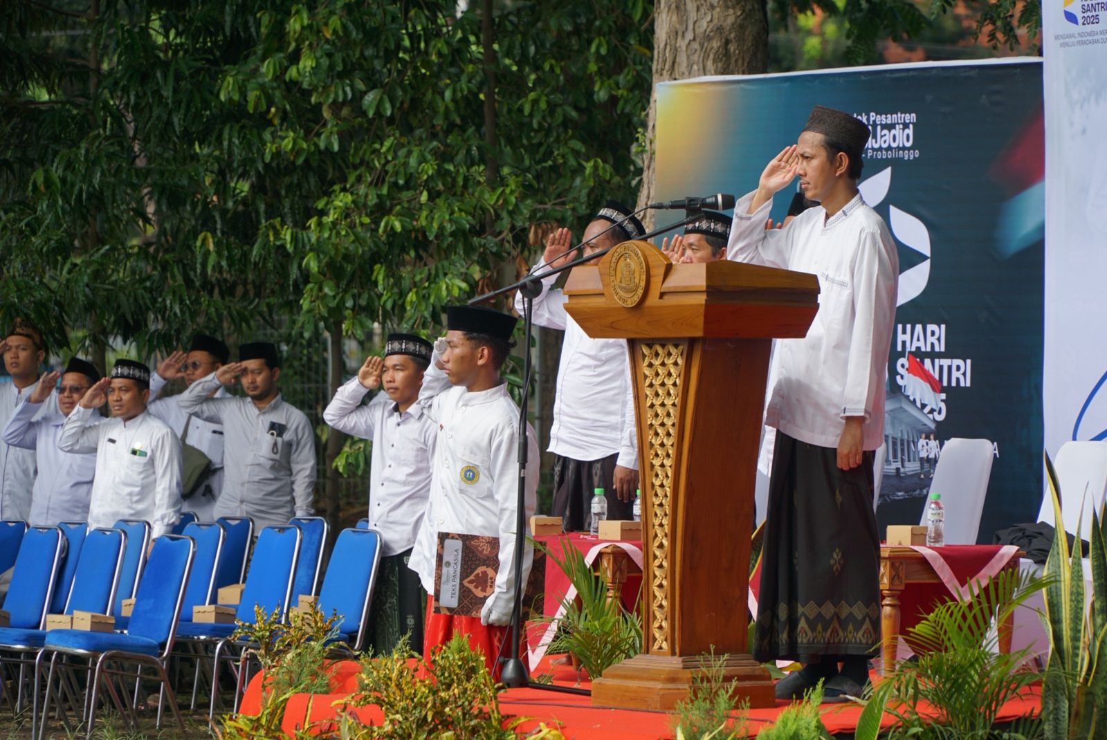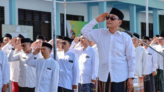 Berseragam putih dan berpeci hitam, mereka berdiri berbaris, khidmat, mengikuti apel peringatan Hari Santri Nasional ke-10, Rabu (22/10/2025).