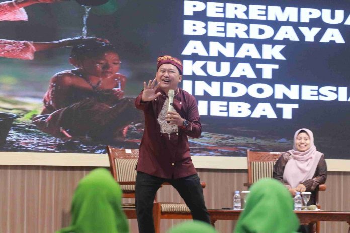 Di depan aula, spanduk besar bertuliskan “Perempuan Berdaya, Anak Hebat, Indonesia Kuat” membingkai panggung sederhana.
