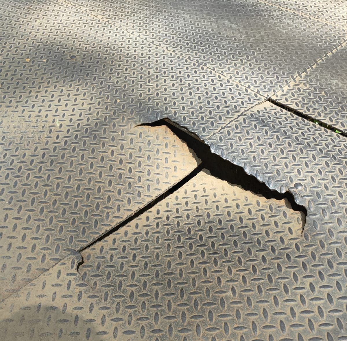 Dari pantauan di lokasi, tampak plat jembatan terkelupas dan sobek, diduga akibat tekanan beban kendaraan. Kondisi itu menyebabkan permukaan jembatan melengkung dan menciptakan lubang yang cukup besar.