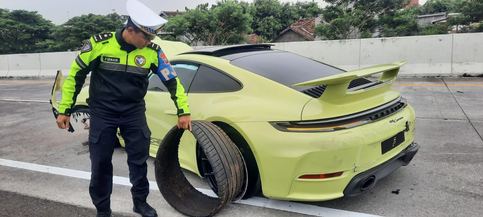 Ban Pecah, Sedan Porsche Hantam Pembatas Tol Paspro