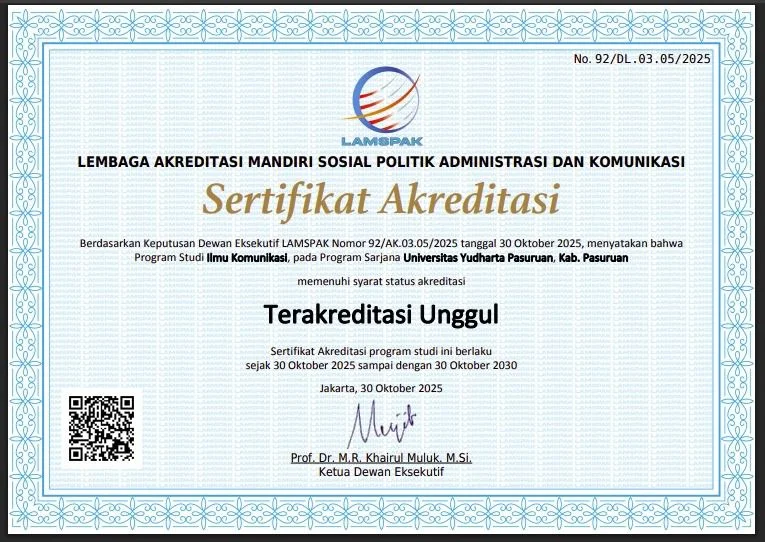 Pasuruan (WartaBromo.com) – Program Studi (Prodi) Ilmu Komunikasi Program Sarjana Universitas Yudharta Pasuruan resmi meraih akreditasi “Unggul” berdasarkan Surat Keputusan Dewan Eksekutif Lembaga Akreditasi Mandiri Sosial Politik Administrasi dan Komunikasi (LAMSPAK) Nomor 92/AK.03.05/2025 tertanggal 12 November 2025.