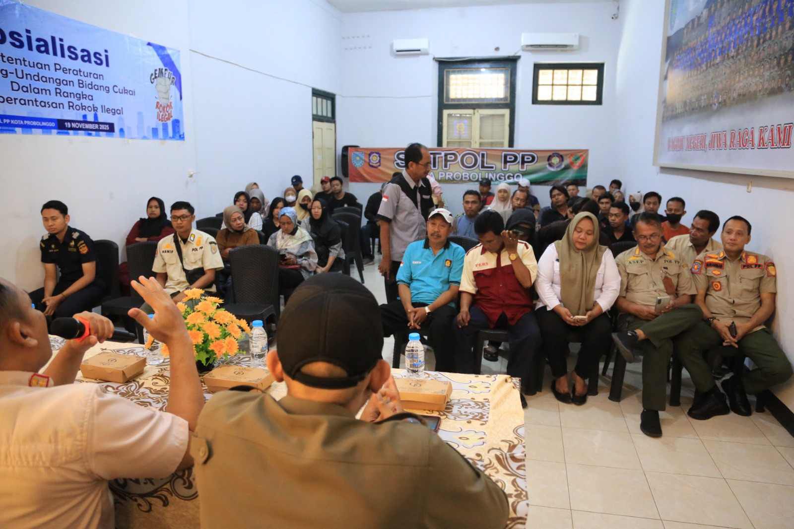 Satpol PP bersama Bea Cukai Probolinggo menggelar Sosialisasi Ketentuan Peraturan Perundang-undangan Bidang Cukai yang menyasar para pedagang kaki lima (PKL), Rabu (19/11/2025).