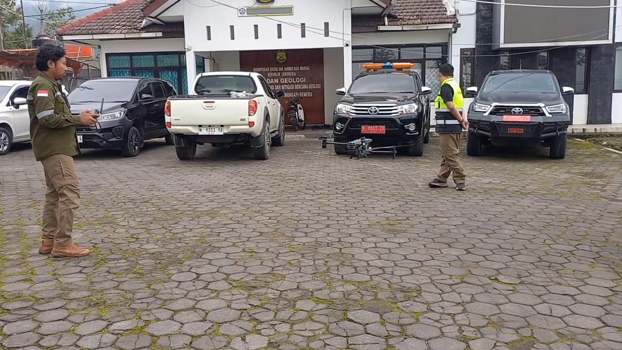 Salah satu pilot menerbangkan pesawat tanpa awak atau drone persis di halaman Pos Pengamatan Gunung Api Semeru.