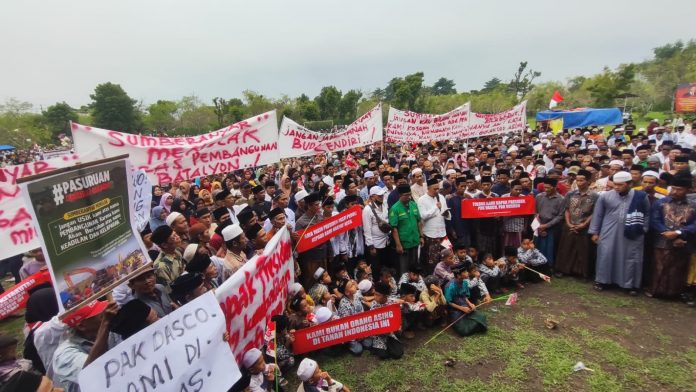 Sejak siang hari, warga berdatangan bersama keluarga. Ibu-ibu, bapak-bapak hingga anak-anak memadati lapangan, larut dalam doa dan lantunan istighotsah. Sejumlah spanduk berisi tuntutan pengembalian hak tanah dan pesan kepada Presiden Prabowo turut dibentangkan oleh warga.
