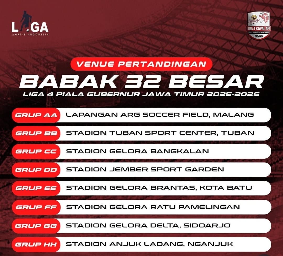 Berikut daftar venue resmi babak 32 besar Liga 4 Piala Gubernur Jawa Timur 2025–2026: