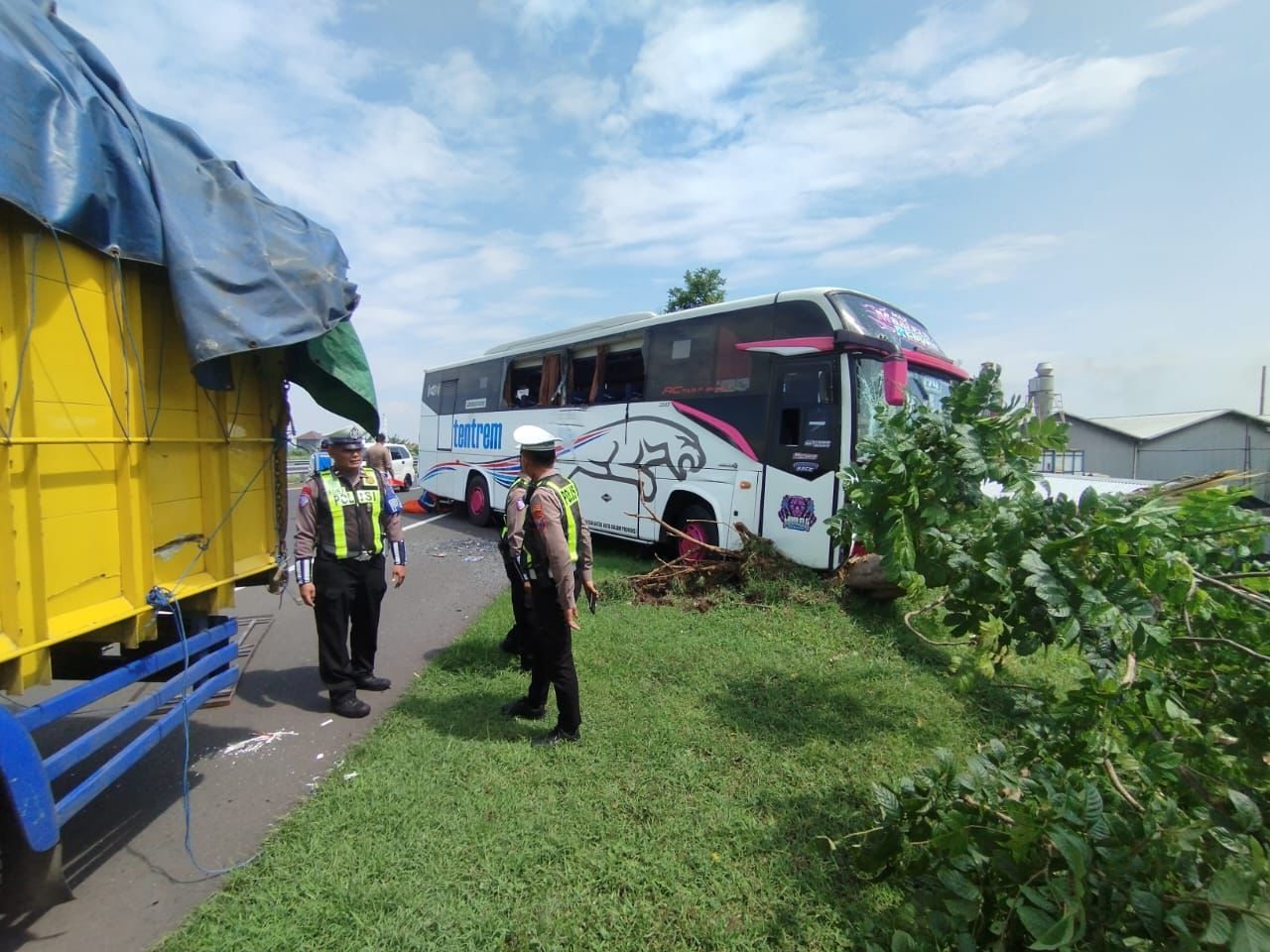 “Bus menabrak bagian belakang truk Colt Diesel. Akibat benturan tersebut, bus oleng dan kemudian menabrak pohon di jalur ROW tol,” ujar Iptu Syarif.