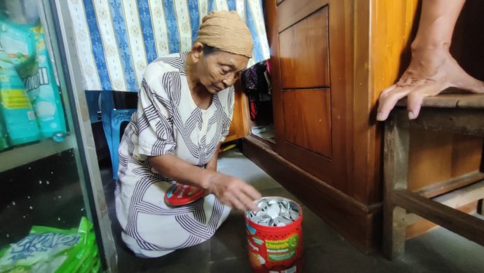 “Di almari ada empat kaleng. Dua diambil. Satu isinya koin Rp500, satu lagi koin Rp1.000,” kata Tumini, nenek yang memiliki 10 cucu itu.