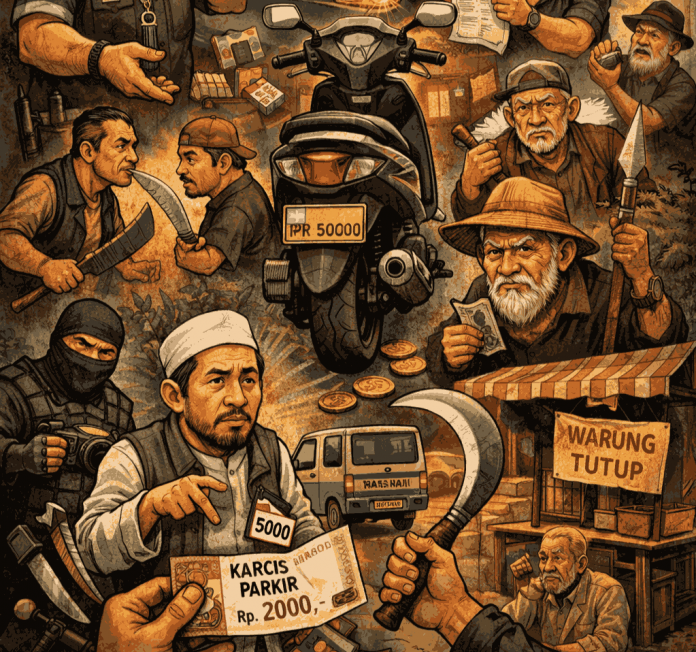Konon katanya, para bos berebut lahan parkir tak kalah seru dengan para pemimpin kartel, triad atau yakuza. Memang tak ada perang antar geng, tak ada penyerangan pemimpin kartel, namun berani mengusik bumi milik Gusti Allah yang sudah dibagi-bagi, bisa dicelurit orang. Dan itu semua bisa terjadi, pasti sudah atas restu guberment atau sherif setempat.