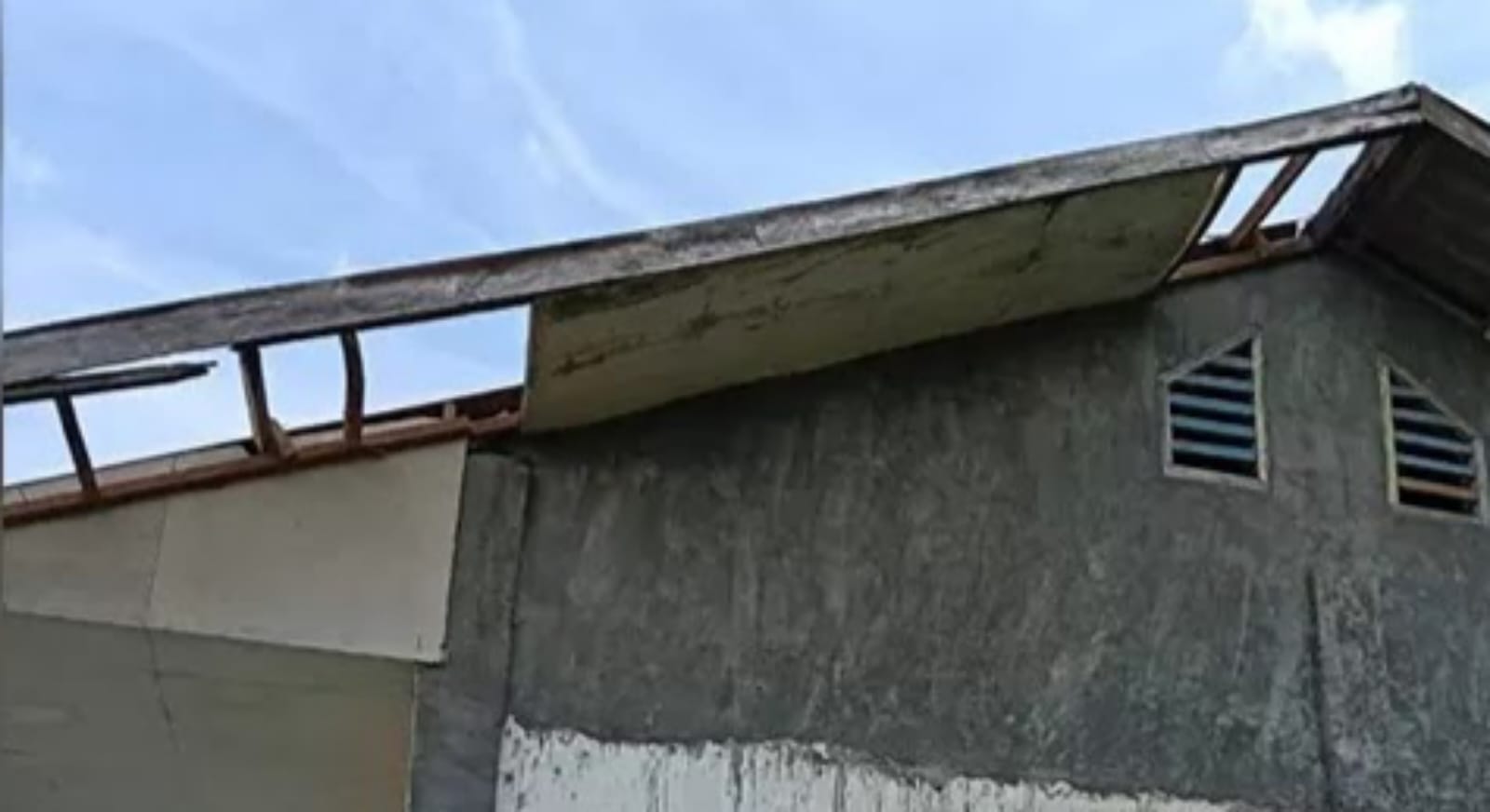 Bagian atap gedung sekolah sisi barat yang berbahan asbes gelombang terlepas dan beterbangan, disusul robohnya sejumlah plafon di dalam ruangan.