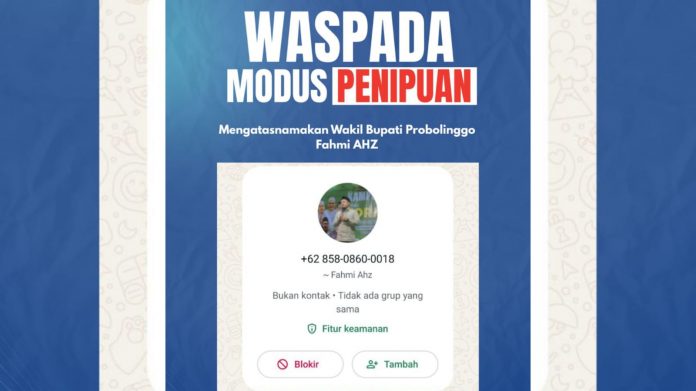 Probolinggo (WartaBromo.com) — Masyarakat Kabupaten Probolinggo diimbau meningkatkan kewaspadaan terhadap modus penipuan yang mengatasnamakan Wakil Bupati Probolinggo, Fahmi AHZ.