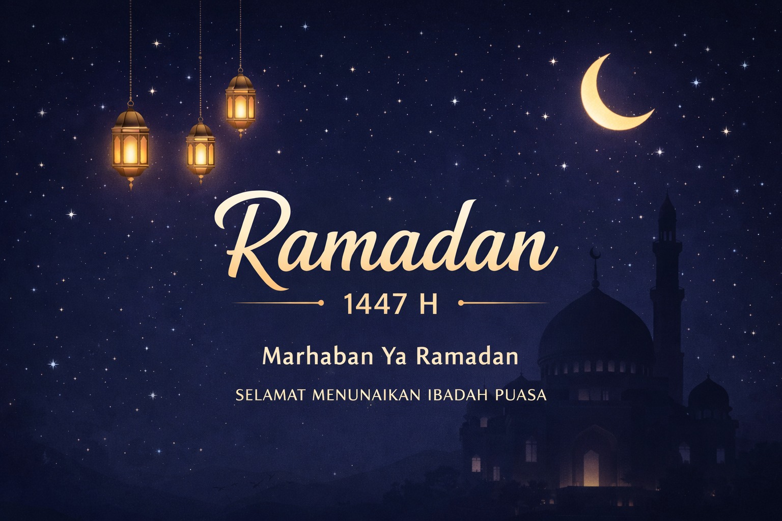 9. “Desain poster ucapan Marhaban Ya Ramadan 1447 H, latar langit malam, bintang bersinar, suasana damai dan spiritual.”