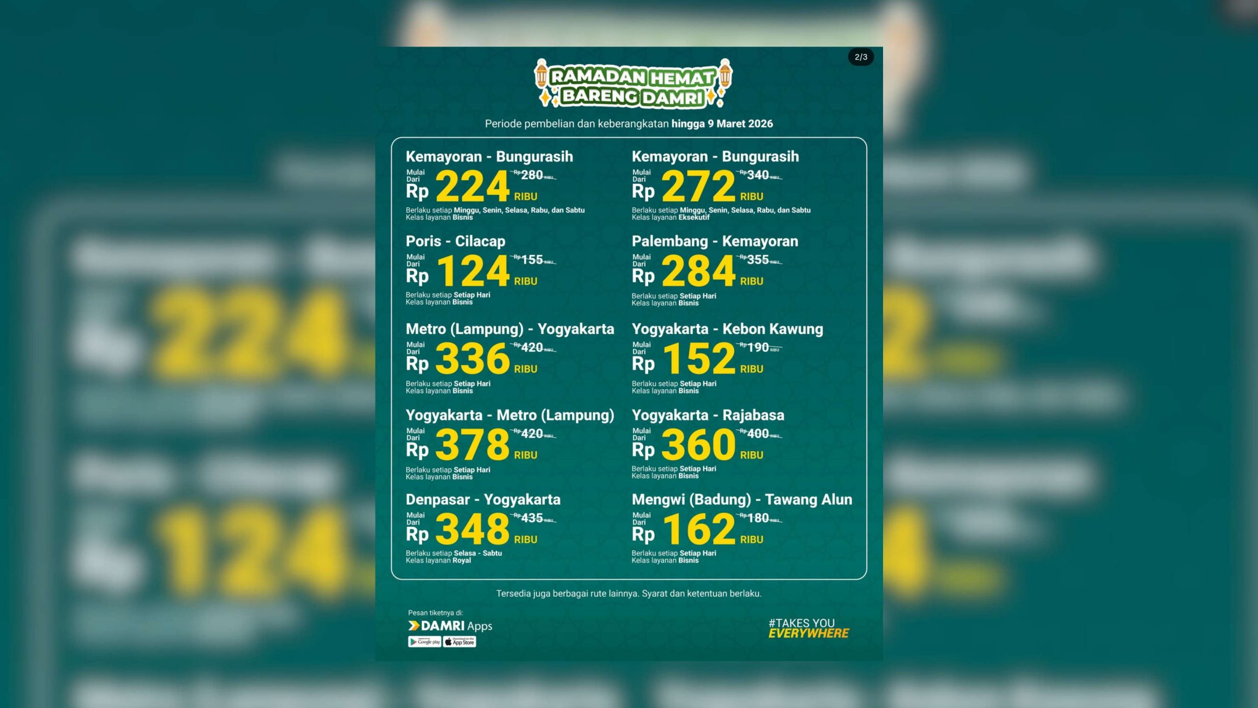 Selain rute tersebut, DAMRI juga menyediakan berbagai rute lainnya dengan syarat dan ketentuan yang berlaku selama program Ramadan 2026. (Jun)