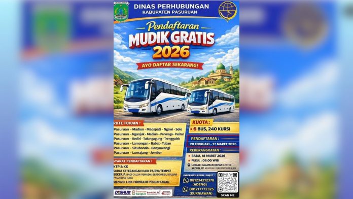 Pasuruan (WartaBromo.com) – Pemerintah Kabupaten (Pemkab) Pasuruan bersama Polres Pasuruan resmi membuka pendaftaran program mudik gratis Lebaran 2026. Program ini disiapkan untuk membantu masyarakat pulang kampung dengan transportasi yang aman dan nyaman menjelang Hari Raya Idul Fitri.
