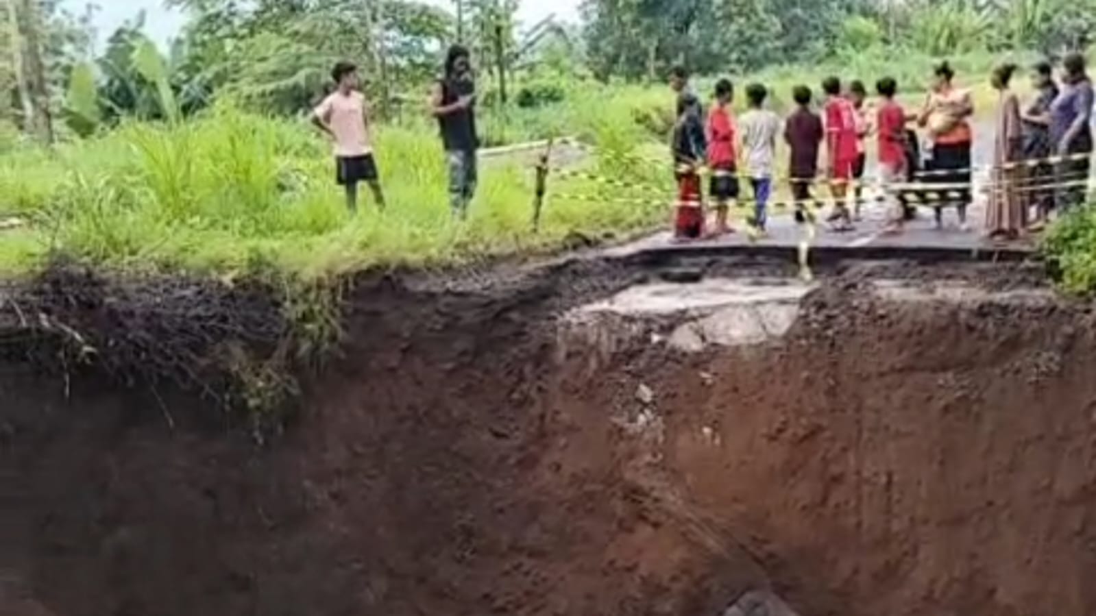 Keesokan paginya, Minggu (22/2/2026), kondisi jembatan tampak rusak parah. Badan jembatan patah dan ambles, menyisakan tebing tanah yang tergerus dalam.