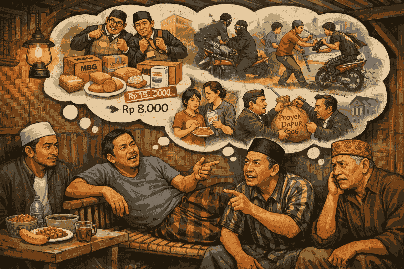 “Program semulia ini, mbok yo ngamek batine ojo nemen-nemen,” gerutu Mahmud Wicaksono seraya rebahan di lincak warung Cak Sueb. “Masa menu MBG yang setiap porsinya dijatah sebesar 15.000 ribu, hanya berisi tempe bacem, rolade dan buah jambu tanpa makanan utama yang layak. Kalau dihitung-hitung, bisa jadi perporsi hanya seharga 8.000 ribu. Kenemenen. Ini ngentit apa merampas sih?”
