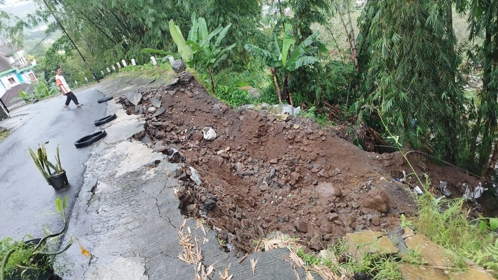 Banjir tak hanya membawa genangan air, tetapi juga material lumpur yang merusak lingkungan sekitar. Sementara itu, derasnya aliran air menyebabkan salah satu bahu jalan desa longsor karena tak mampu menahan debit air. Kondisi ini mengganggu akses warga dan memicu kekhawatiran akan longsor susulan jika hujan kembali turun.