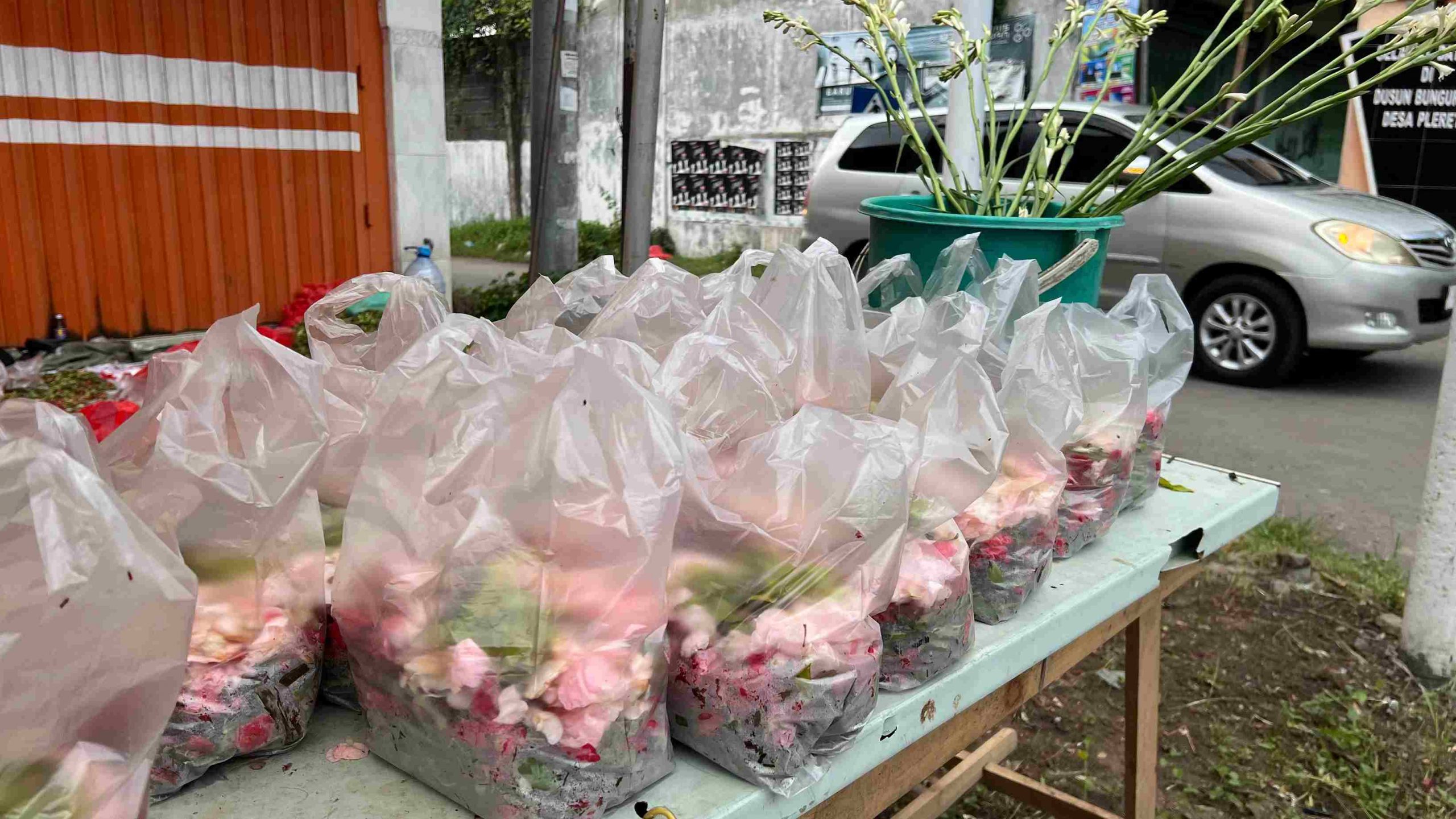 Selain bunga satuan, paket kembang tabur atau yang dikenal sebagai “bore” juga mengalami penyesuaian harga. Saat ini, satu kresek bore dijual sekitar Rp5.000.