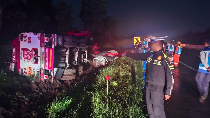 Pasuruan (WartaBromo.com) – Sebuah truk tangki milik Pertamina bermuatan bahan bakar jenis Pertamax mengalami kecelakaan tunggal di ruas Tol Pandaan–Malang, tepatnya di KM 70.400/A, pada Kamis (2/4/2026) malam. Insiden yang terjadi sekitar pukul 23.18 WIB ini diduga kuat dipicu oleh pengemudi yang mengantuk.
