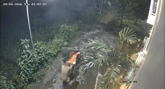 Tak butuh waktu lama, dua pelaku berhasil menggondol motor jenis Honda CRF dengan cara dituntun keluar dari lokasi. Bahkan, salah satu pelaku terlihat membawa senjata tajam jenis pedang saat melancarkan aksinya.