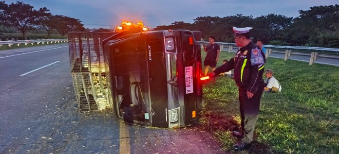 Pecah Ban, Pick Up Muatan Ayam Terguling di Tol Gempol–Pasuruan