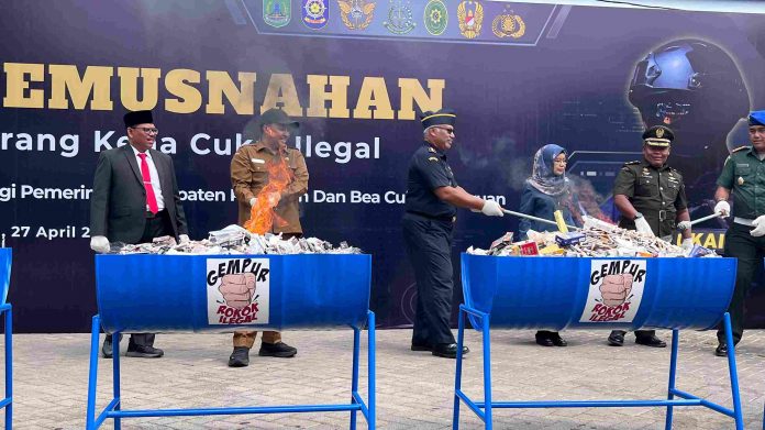 Bangil (WartaBromo.com) – Bea dan Cukai Pasuruan memusnahkan sebanyak 10,014 ton barang kena cukai ilegal di halaman Kantor Bupati Pasuruan, Senin (27/4/2026). Barang ilegal tersebut didominasi jutaan batang rokok tanpa pita cukai, dengan total potensi kerugian negara mencapai lebih dari Rp6,3 miliar.