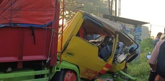 Truk Muat Kardus Disasak Kereta Api di Beji