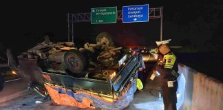 Ban Pecah, Pikap Bermuatan Cabai Terguling di Tol Pasuruan–Probolinggo