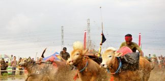 Lumpur berhamburan, penonton bersorak, dan 25 pasang sapi...
